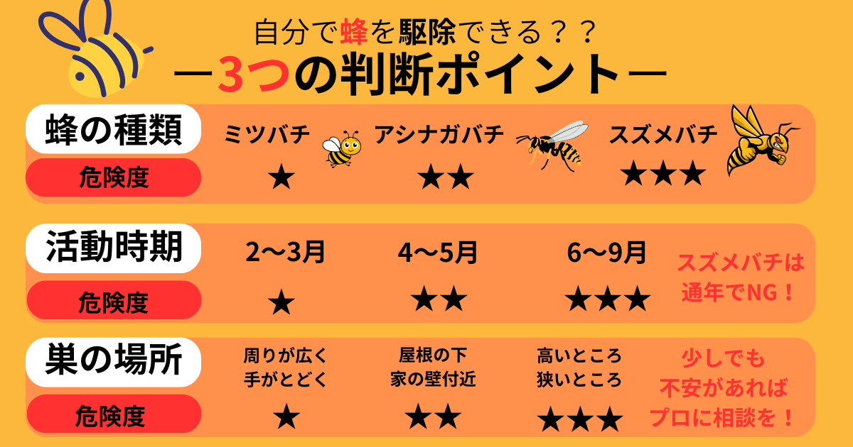 基本的に自力での蜂駆除はおすすめできません。しかし、どうしても自分たちで行いたいというご要望にお応えするため、ここでは蜂を退治できるかできないかの判断基準を危険度別で紹介します。