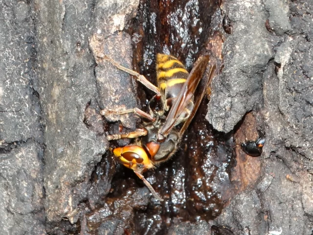 体長は25〜40mmと大きく、オレンジ色や黄色、黒のしま模様が特徴です。見つけやすい反面、攻撃性が高いので、近づかず距離を保つことが安全です。